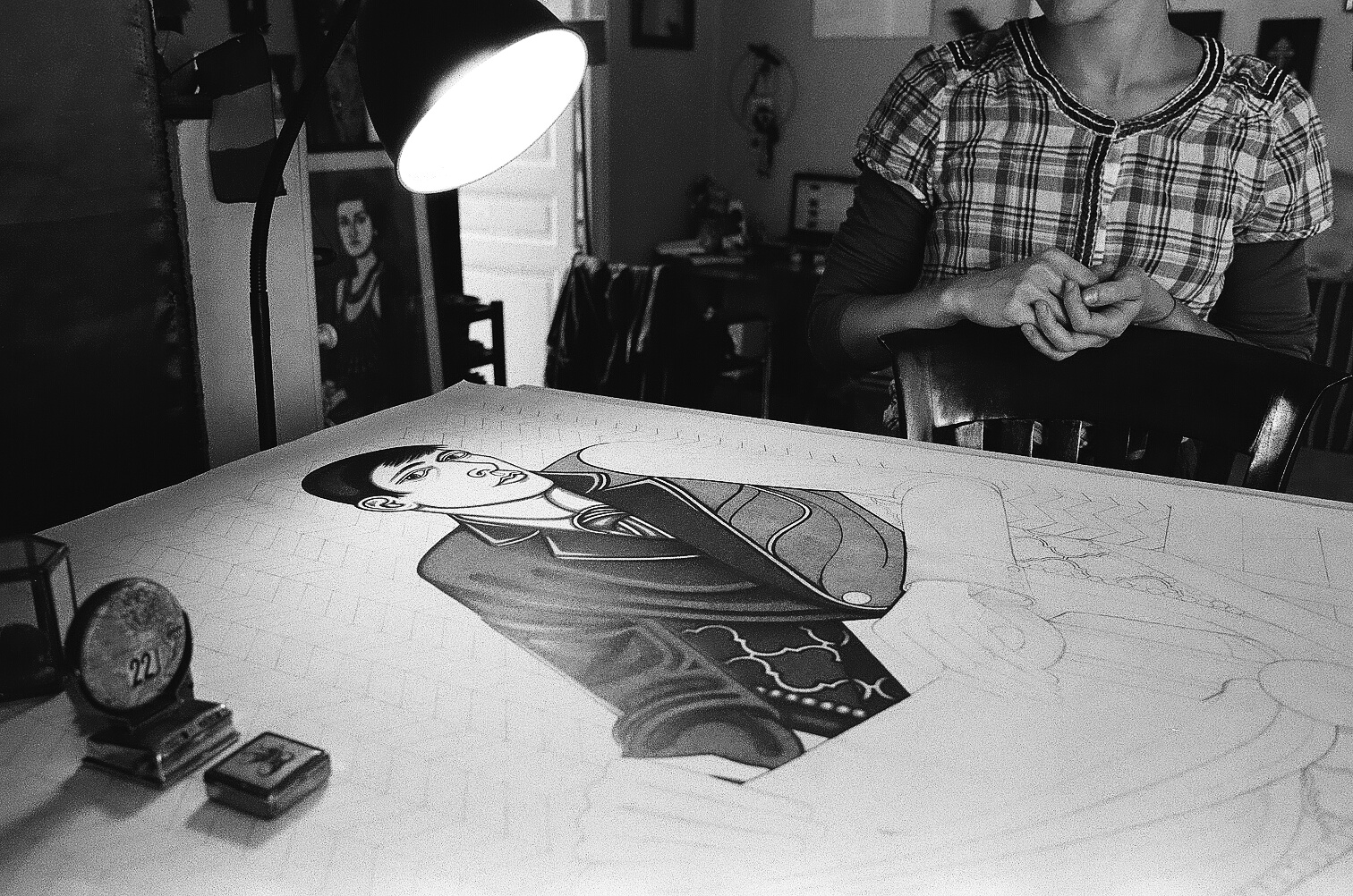 L'oiseau de papier à la table de l'homme qui fume ou la bichromie de Songe du Cabinet, font régner sur le travail d'Anaïs Boucheret une atmosphère étrange et solennelle.